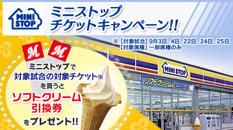 | キャンペーン内容 | 特定5試合、特定の席種を対象にミニストップ店舗でチケットを発券(ご購入)いただいたお客様にチケット1枚につき、1枚「ミニストップソフトクリーム(バニラ)」をプレゼントいたします。 |