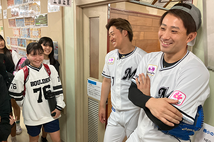 選手の到着が近づくと噂を聞きつけた児童たちが、「いつ来るの?」「会えるかな?」と控室となる校長室を覗きにやってきます。そんな高嶺小学校には、種市篤暉投手、田中晴也投手が訪問しました。