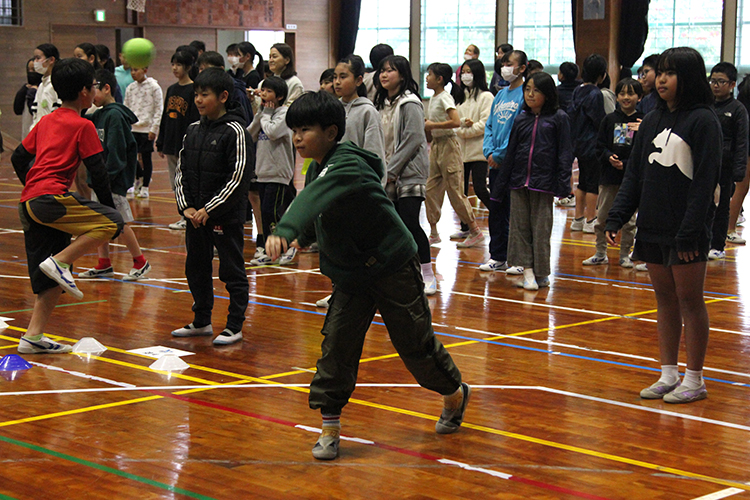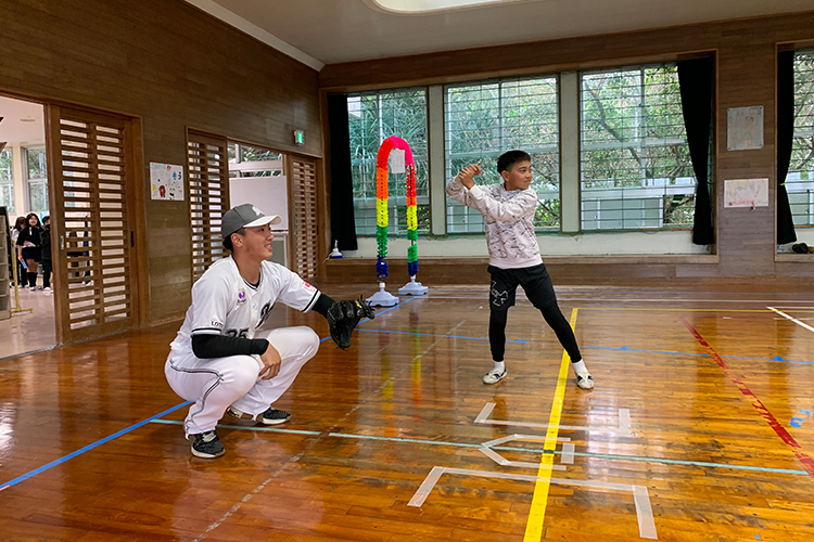 交流会では質問コーナーや捕る・投げる動作を練習しました。硬球でのキャッチボール披露では、マウンドからホームベース間18.44mの距離で投げます。児童からは「テレビで見ると近く感じるけど、意外と遠くてビックリ!選手ってすごい!」と驚いていました。
