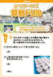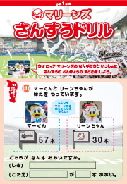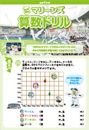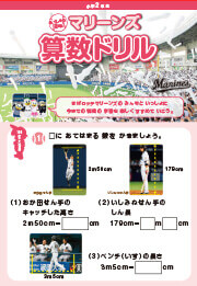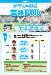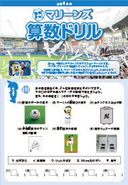 「マリーンズ算数ドリル」(春休み用)は、大変好評だった夏休み用・冬休み用に引き続き、千葉市教育委員会の後援、NPO法人ちば算数・数学を楽しむ会の制作協力のもと、マリーンズが制作した、野球やマリーンズの問題が満載のドリルです。小学校1年生用から6年生用まで6種類の算数ドリルが用意されており、千葉市内の全児童約52,000人が春休みの教材として学習する予定です。