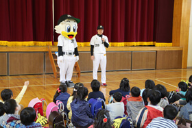 4月11日(木)に松永投手とマーくんが千葉市立高浜海浜小学校を訪問し、新1年生61名にランドセルカバーを贈呈しました。