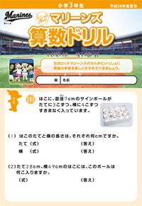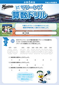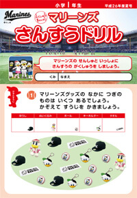 「マリーンズ算数ドリル」は、NPO法人「ちば算数・数学を楽しむ会」の製作協力のもと、千葉ロッテマリーンズが製作をしたもので問題にマリーンズの選手が登場したり、野球に関する出題があり、楽しみながら勉強ができる内容が満載となっています。