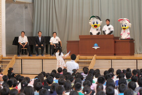 7月15日(火)藤岡貴裕選手とマーくん、リーンちゃんが美浜打瀬小学校を訪問し、マリーンズ算数ドリルを贈呈しました。