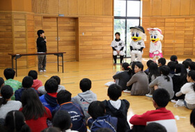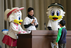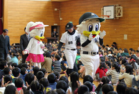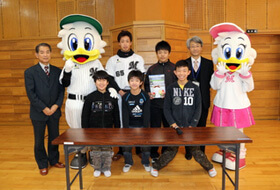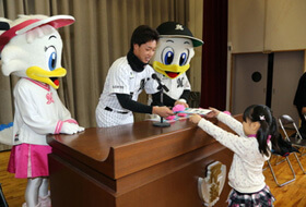 12月18日(木)加藤翔平選手とマーくん、リーンちゃんが新宿小学校を訪問し、マリーンズ算数ドリルを贈呈しました。