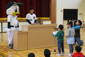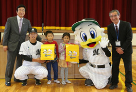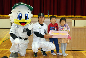 4月21日(火)に中村選手とマーくんが千葉市立幸町小学校を訪問し、新1年生62名にランドセルカバーを贈呈しました。