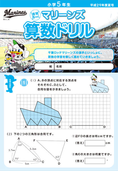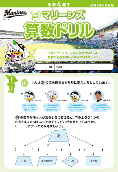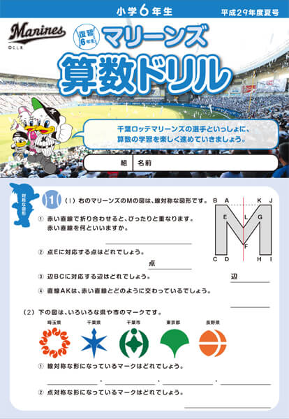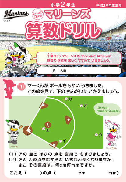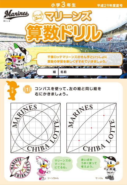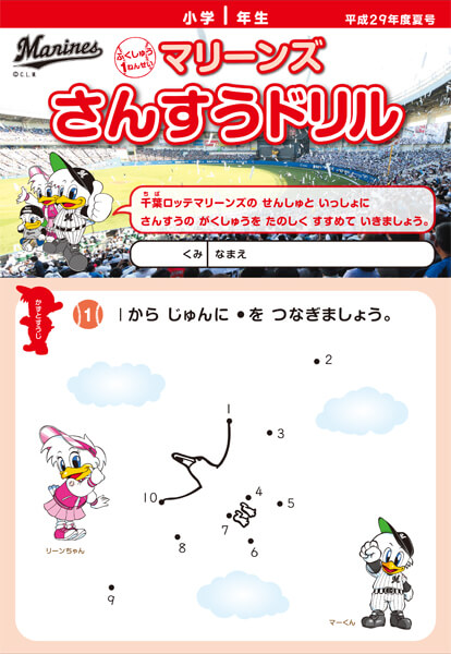 「マリーンズ算数ドリル」は、NPO法人「ちば算数・数学を楽しむ会」の製作協力のもと、千葉ロッテマリーンズが製作をしたもので問題にマリーンズの選手が登場し、野球に関する出題があり、楽しみながら勉強ができる内容が満載です。