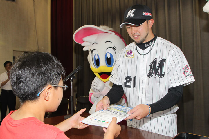 配布に先立ち、7月4日(火)に内 竜也選手が千葉市立稲丘小学校を訪問し贈呈のセレモニーを行いました。