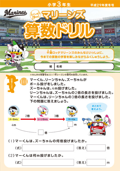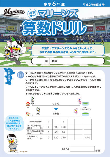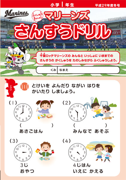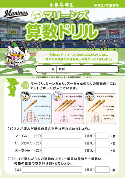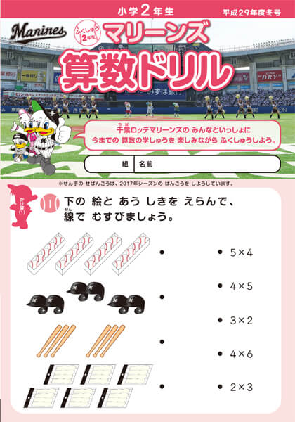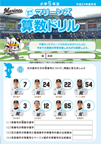 「マリーンズ算数ドリル」は、NPO法人「ちば算数・数学を楽しむ会」の製作協力のもと、千葉ロッテマリーンズが製作をしたもので問題にマリーンズの選手が登場し、野球に関する出題があり、楽しみながら勉強ができる内容が満載です。