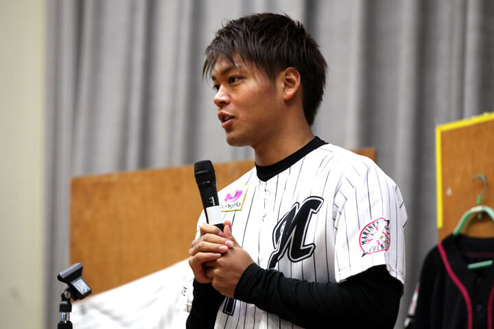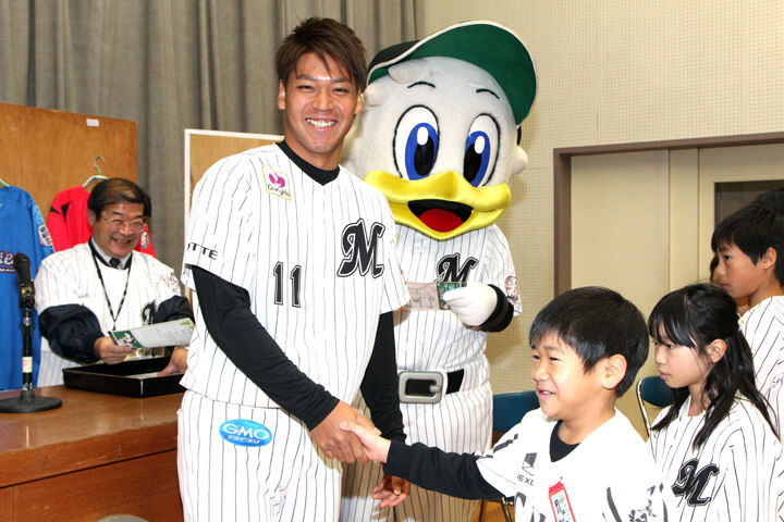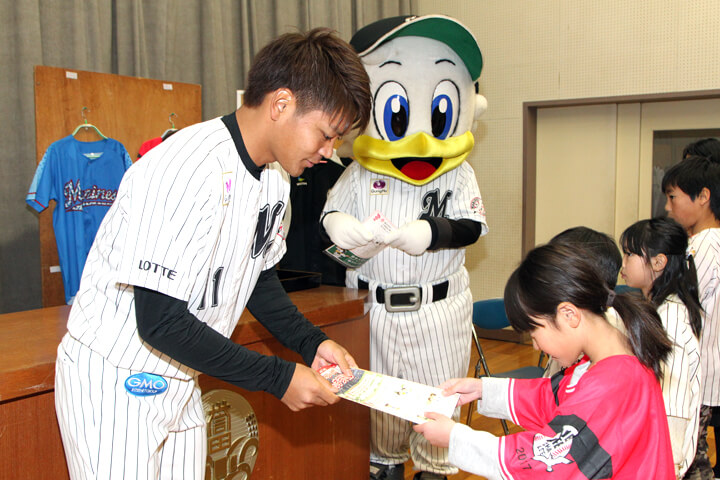 配布にともない、12月20日(水)に佐々木千隼投手が千葉市立誉田小学校を訪問し、贈呈のセレモニーを行いました。