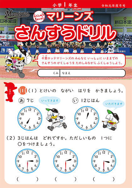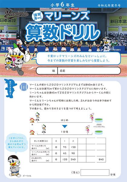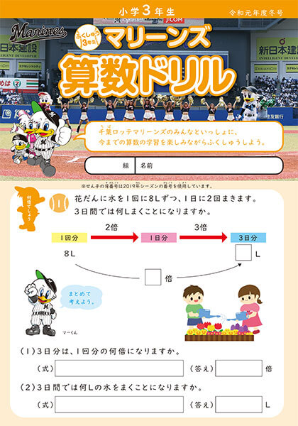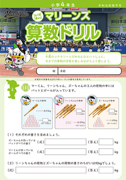 「マリーンズ算数ドリル」は、NPO法人「ちば算数・数学を楽しむ会」の製作協力のもと、千葉ロッテマリーンズが製作をしたもので問題にマリーンズの選手が登場し、野球に関する出題があり、楽しみながら勉強ができる内容が満載です。