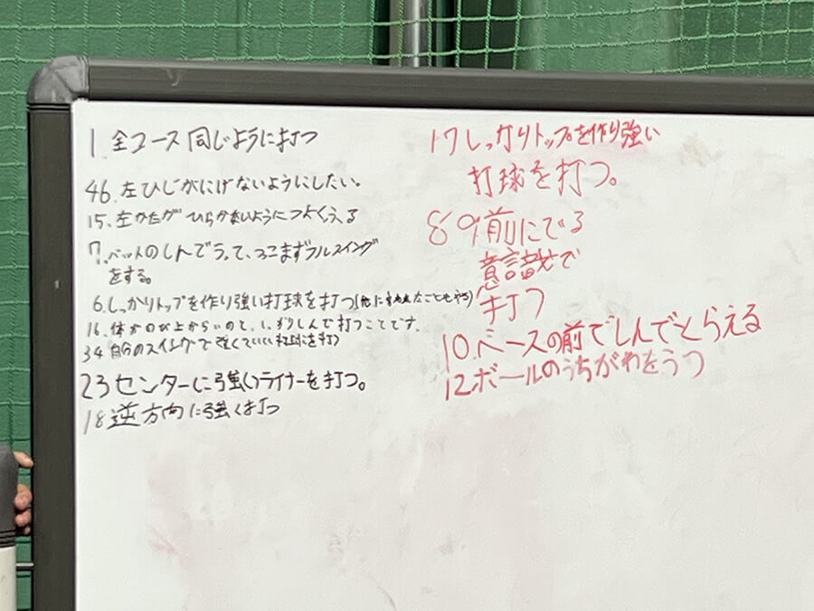 午後の練習前に打撃面での個人目標をホワイトボードに書き、常に目標に向かって取り組めるよう意識づけを行いました。