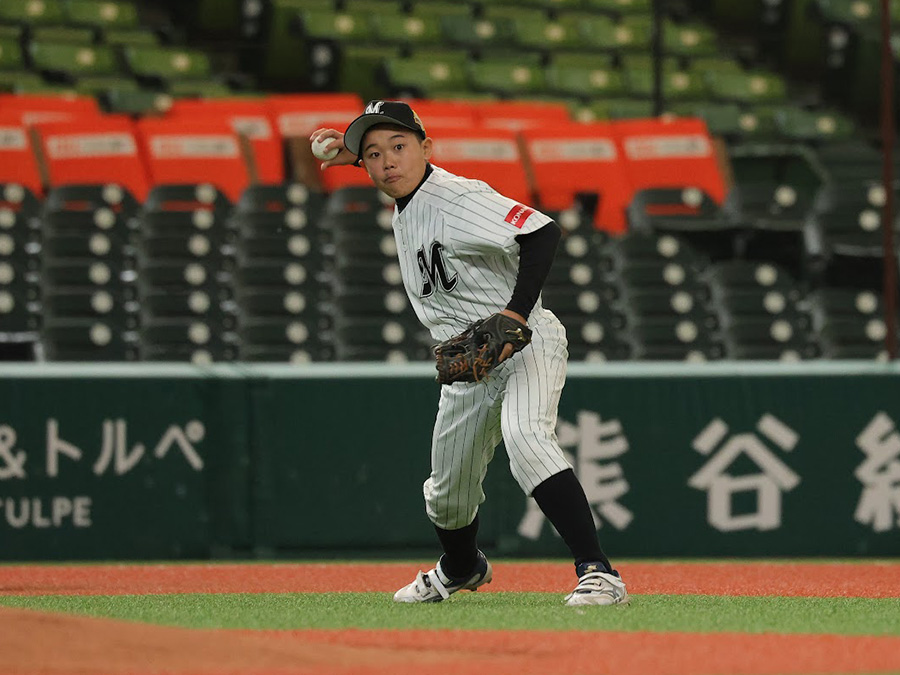 初回マリーンズジュニアの攻撃では、降旗真斗選手がライトへのヒットで出塁し、続く石井大翔選手がセカンドに痛烈な打球を打ち、ランナー1・3塁。この場面で菅沼琉稀選手がライトへの犠牲フライを打ちマリーンズジュニアが先制しました。4回に池邉周吾選手が四球で出塁すると、越知龍之介選手が代走へ。続く大山穰選手の強烈なセカンドライナーで相手のエラーを誘い、その間、俊足の越知選手がホームインし、追加点を取りました。5回には降旗選手がレフト方向にエンタイトルツーベースを放つと、続く石井選手が左中間へのヒットを放ち、その間に降旗選手がホームに走りましたが、相手の送球がよく、アウトになってしまいました。