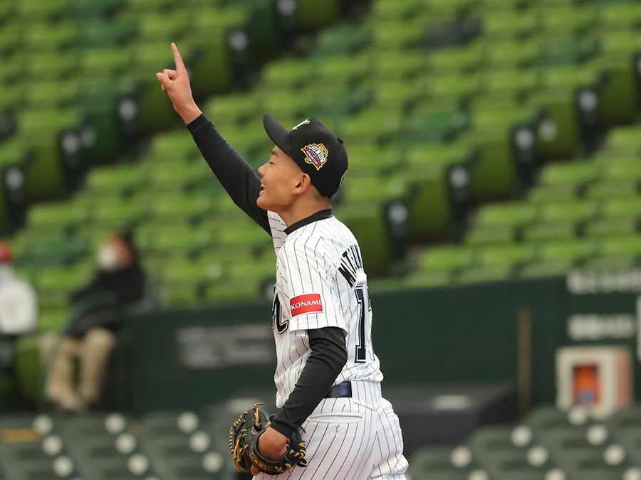 5回までマウンドに立った松倉颯汰選手は緊張した表情を見せながらも、自分のピッチングを貫き、時に仲間に援護されながら5回1失点の好投をみせました。最終回石井大翔選手がマウンドにあがりました。打者2人を打ち取り、二死からラストバッターをストレートで四球を許すと、そこから相手に粘りの攻撃をされ、なかなか流れを断ち切ることが出来ず、逆転を許してしまいました。マリーンズジュニアの最終打席に回ってきたのが、蓮見悠選手です。ここまでたくさんの努力と悔しい想いをしてきた選手です。なんとか最後まで粘りを見せるも最後は手が出ず、敗北する結果となりました。