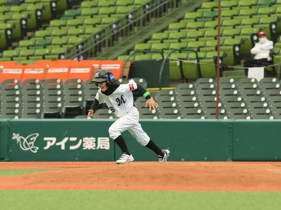 初回バッファローズジュニアの攻撃では、センター前ヒットで出塁を許すと、二死から4番の選手に本塁打を打たれ先制されてしましました。2回マリーンズジュニアの攻撃では、池邉周吾選手がライト前ヒットで出塁すると、続く大山穰選手がセンターへエンタイトルツーベースを放ち、ランナー2・3塁とチャンスを広げたものの、得点とはなりませんでした。マウンドに立ったピッチャー陣は、どんなに打たれようと点を取られようと仲間のために最後まで相手に立ち向かっていく姿が本当に素晴らしかったです。攻撃では、相手の女子投手のコントロールの良い球に苦戦し、なかなか思うようにチャンスを広げることが出来ず、4回・5回には相手の長打が続き、最後まで点差が縮まらず、敗北する結果となってしまいました。