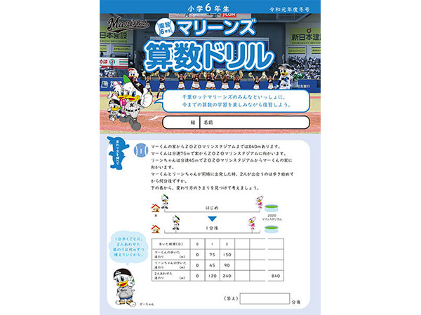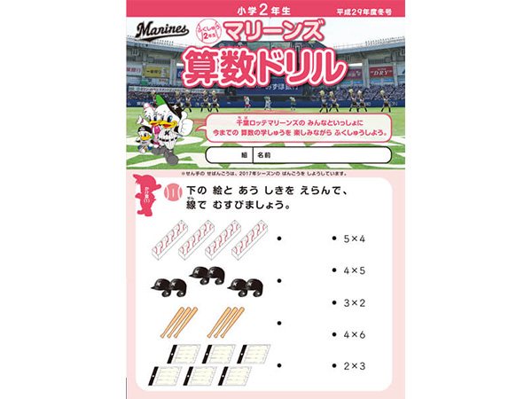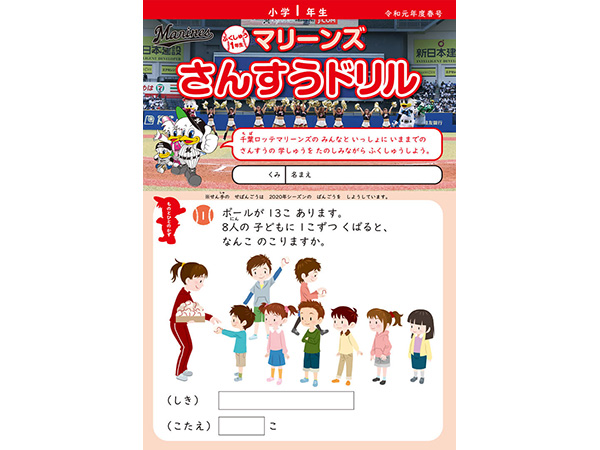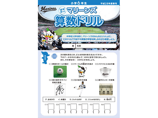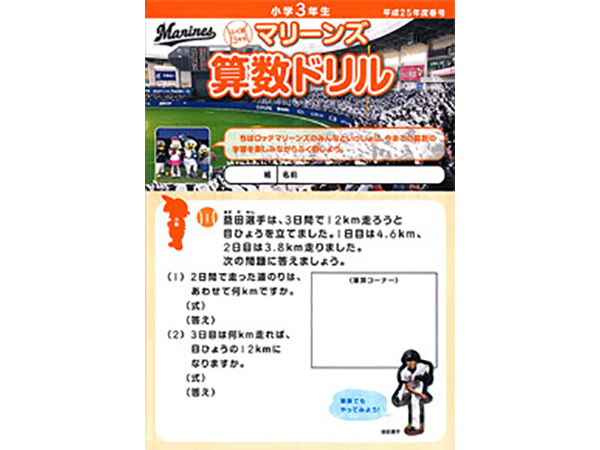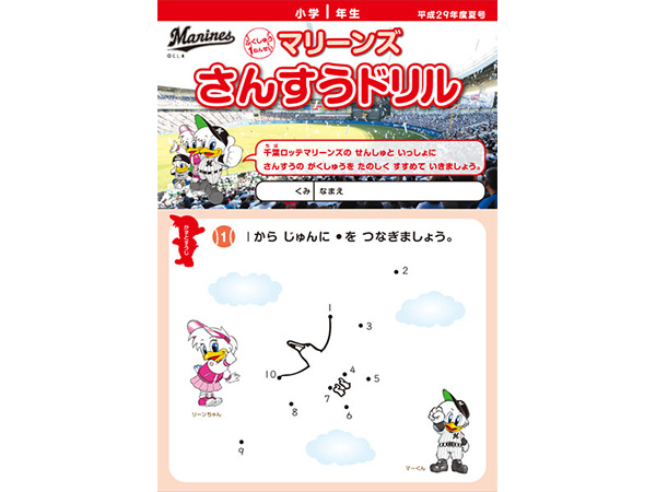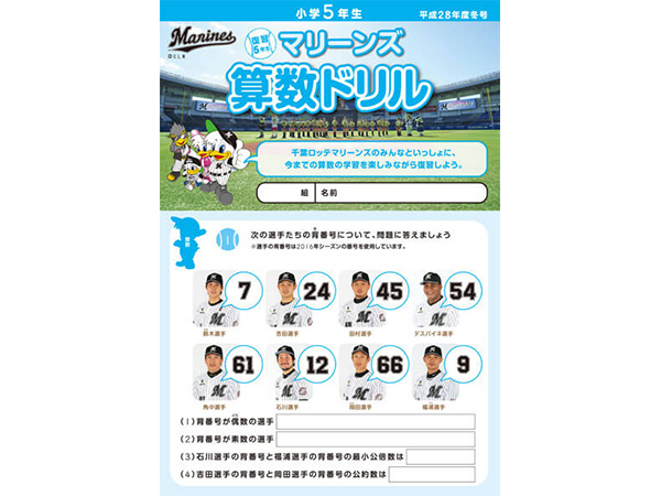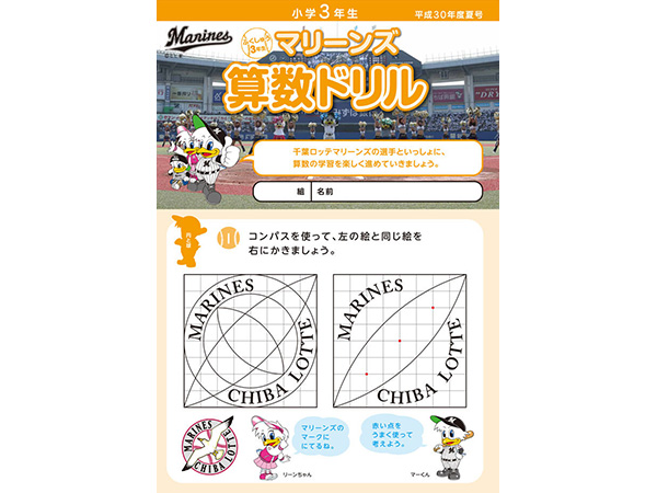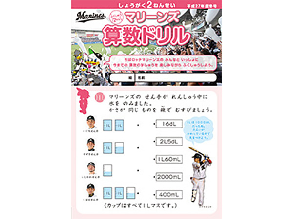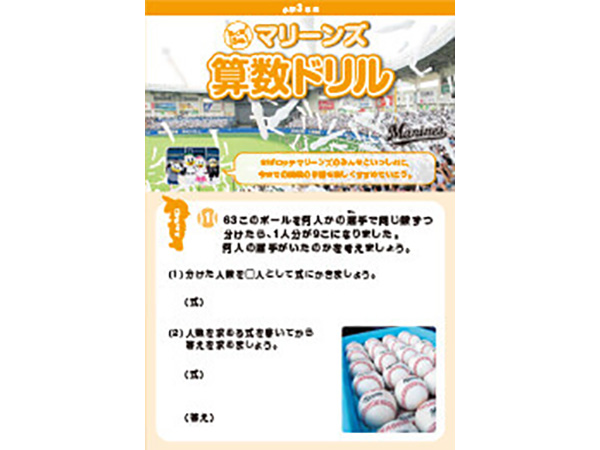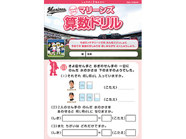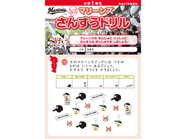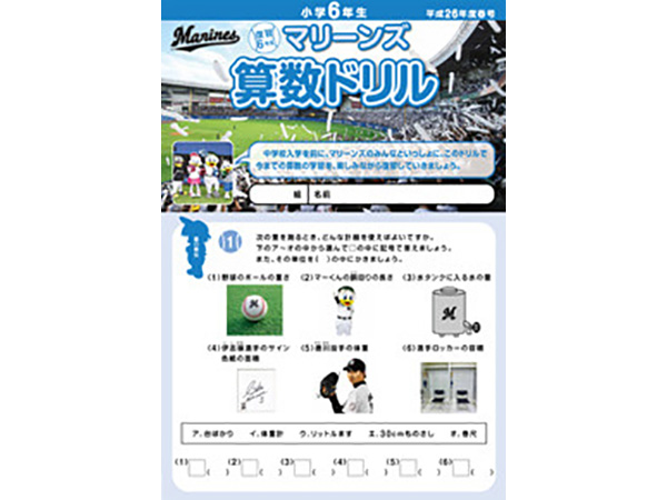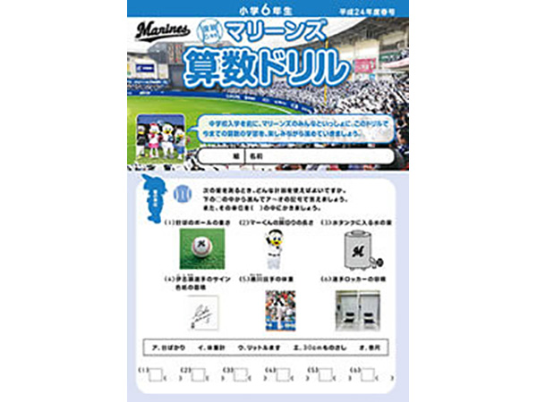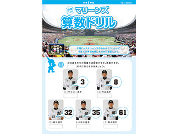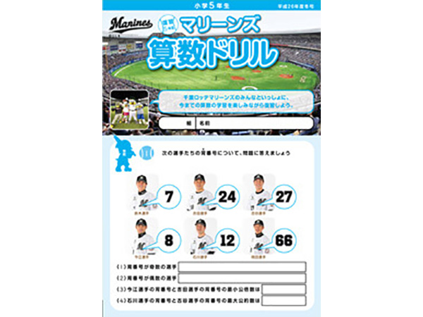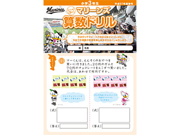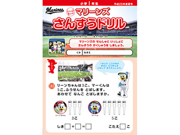 千葉ロッテマリーンズが千葉市教育委員会の後援、そしてNPOちば算数・数学を楽しむ会の制作協力のもとに「マリーンズ算数ドリル」を制作し、千葉市内の小学校へ配布しています。