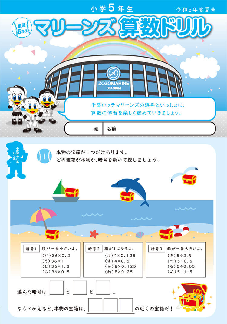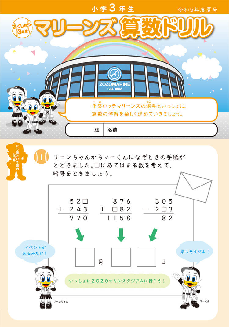 千葉ロッテマリーンズは7月に千葉市内全ての公立小学校(国立大学法人千葉大学教育学部附属小学校や特別支援学校を含む)へ、マリーンズ算数ドリル令和5年度夏号を無償配布しました。「マリーンズ算数ドリル」は、NPO法人「ちば算数・数学を楽しむ会」の制作協力のもと、千葉ロッテマリーンズが制作をしたもので問題にマリーンズの選手が登場し、野球に関する出題があり、楽しみながら勉強ができる内容が満載です。
