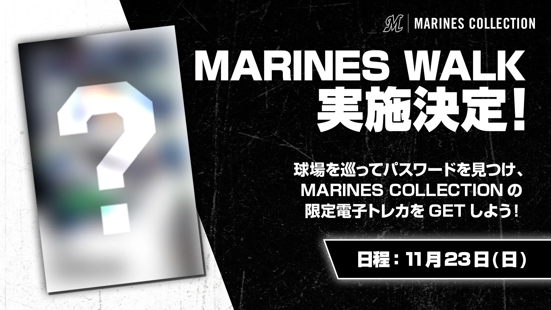 参加方法 | STEP1:MARINES COLLECTIONに登録 STEP2:ZOZOマリンスタジアムに着いたらチェックポイントにあるパスワードを探そう STEP3:パスワードを見つけたら、「MARINES COLLECTION」を起動→ホーム画面左上にある「各種限定トレカ」バナーをタップ STEP4:「MARINES WALK」限定トレカ欄をタップし、チェックポイントごとの画面からパスワードを入力 STEP5:限定電子トレカをゲット!(チェックポイント毎にトレカのデザインが異なります) |