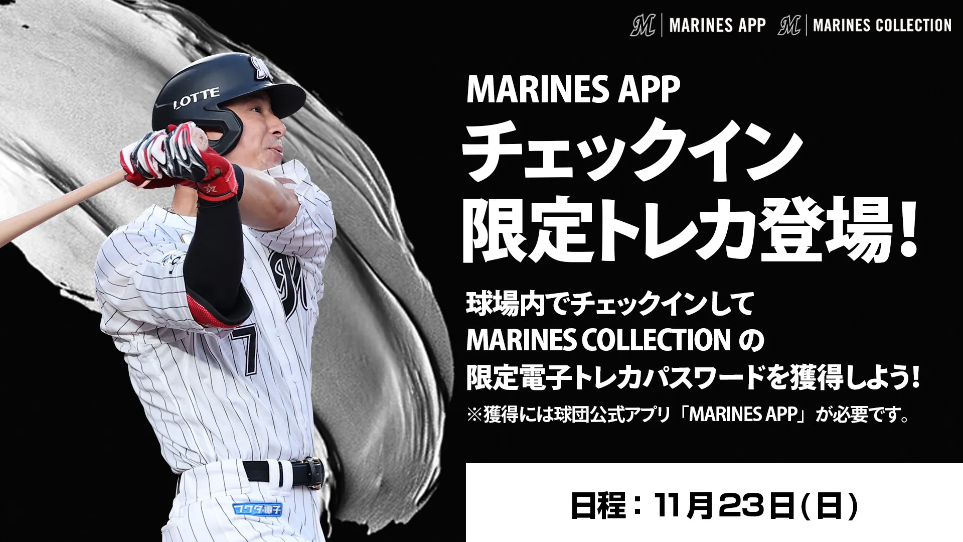 当日アプリをダウンロードした上で、球場内でチェックインすると、球団公式電子トレカコレクション「MARINES COLLECTION」の限定トレカパスワードを獲得できます。