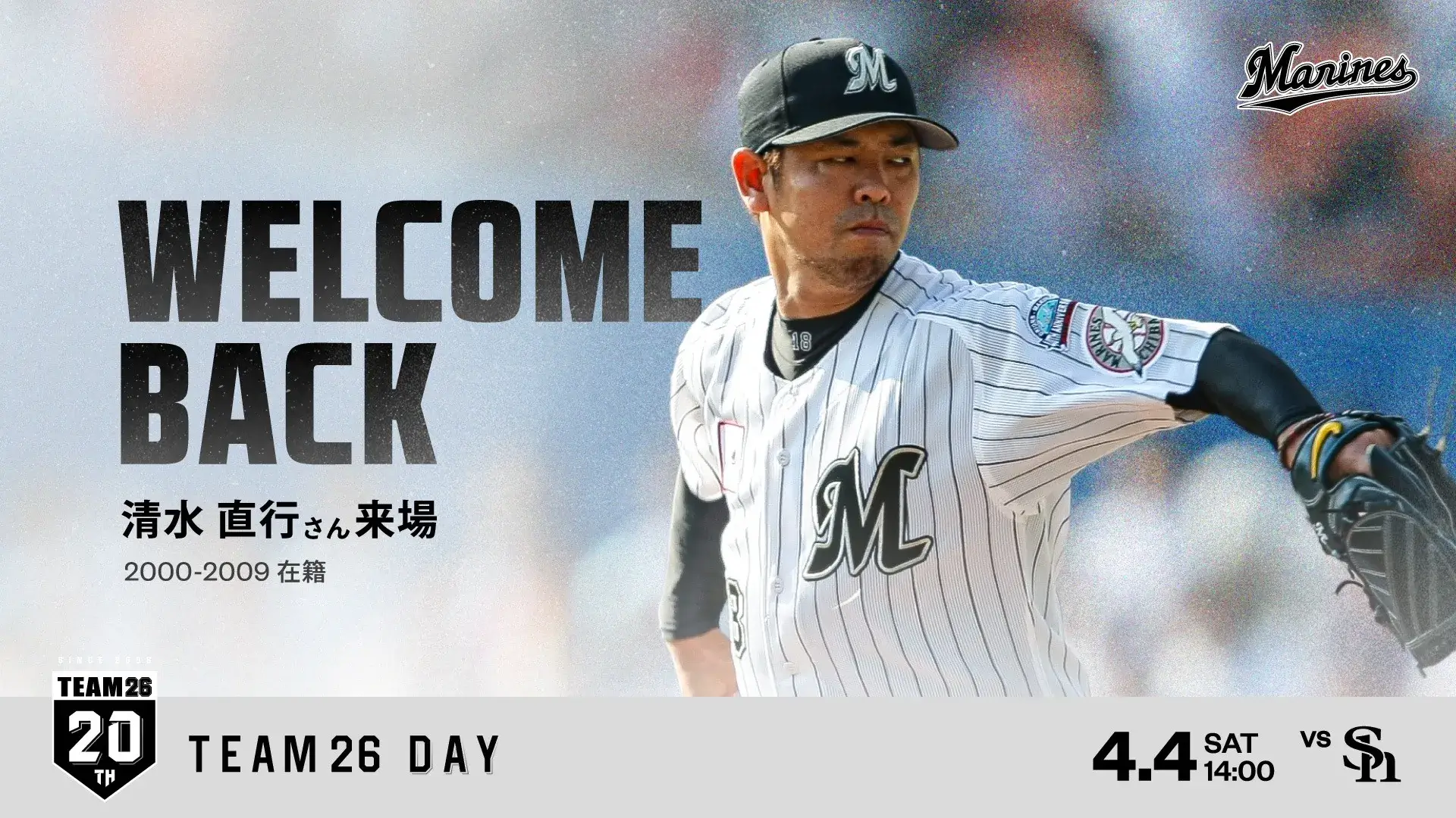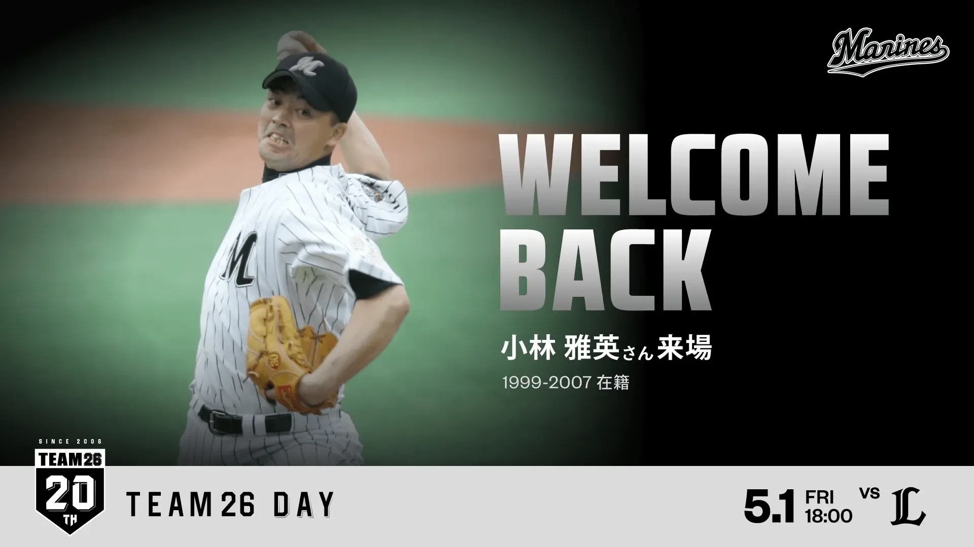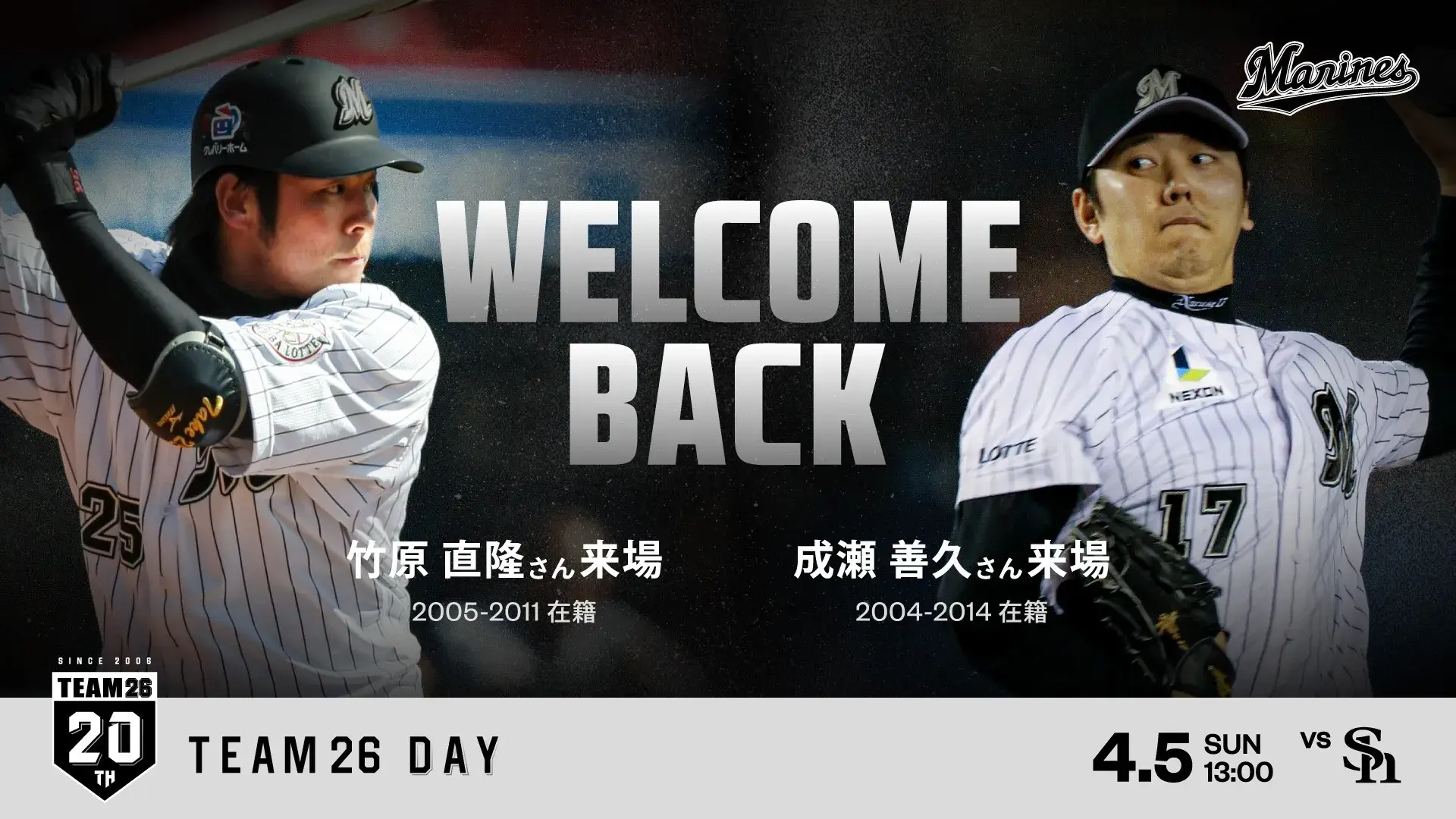 TEAM26 20周年を一緒にお祝いするアンバサダーとして、マリーンズOBの内竜也さんの就任が決まりましたのでお知らせします。TEAM26デーを含む様々なイベントに出演いただき、TEAM26 20周年を盛り上げます。