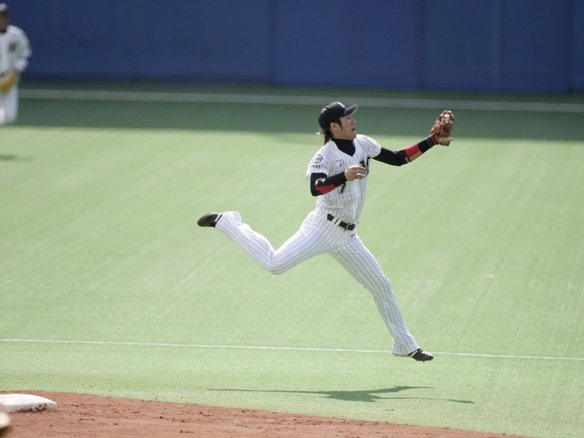 投手 渡辺俊 投手 渡辺 6番 礒部 遊ゴ 2-2から叩きつけ、ピッチャーの頭上を越え高くバウンドした打球。ショート・西岡が回り込んで押さえ、ジャンピングスロー! |