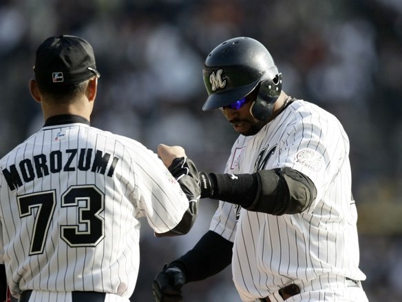 初球、1塁ランナー・渡辺直がスタート。里崎の送球、僅かに及ばす、盗塁成功。 ![]() 0