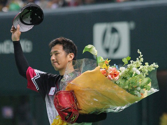 試合を振り出しに戻してもらった小野、気を緩めることなく3人で抑え、1000投球回達成!花束を受け取り、引き締まった表情で、チームメートと握手を交わしてベンチへ戻ります。 |