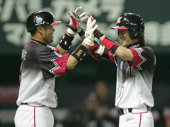 3回表ロッテ無死一塁、西岡剛は2点本塁打を放ち今江とハイタッチを交わす