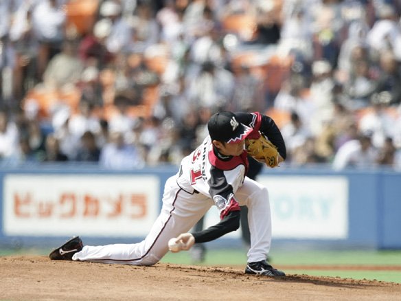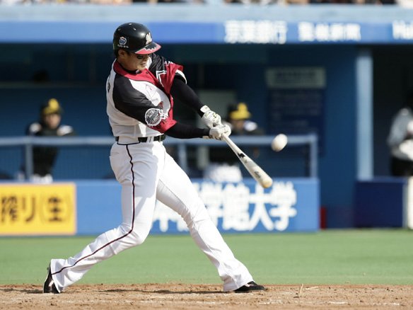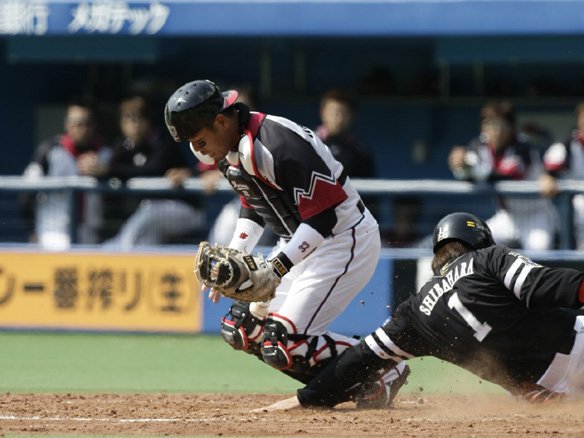 2番 早坂 三ゴ 0-1から泳がされた打球をサード・松田がさばきホームへ返球。3塁ランナー・サブロー、タッチアウト。キャッチャー・山崎はどこにも投げられず、ゲッツーは免れた。 |