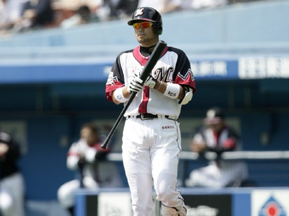 4番 里崎 中飛 初球、真ん中低めへの変化球をすくい上げたが、あとひと伸び足りず・・・。 |