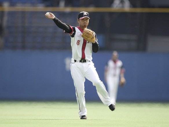 4番 里崎 左飛 1-1から振り抜いた打球。ショート・川崎、レフト・井手が追い、川崎が譲って井手が捕球。 |