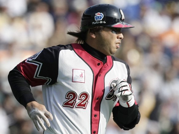 8番 サブロー 四球 ニコースキーの制球が乱れに乱れ、フルカウントからアウトコース低めの際どい変化球を見極め、出塁! |