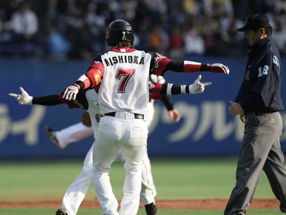 3番 西岡 左安 1-1からインコース高めの変化球を詰まらせながらも振り抜いた打球は、レフトの前へ落ちた!3塁ランナー・今江、サヨナラのホームイン!5X対4!! ![]() 5