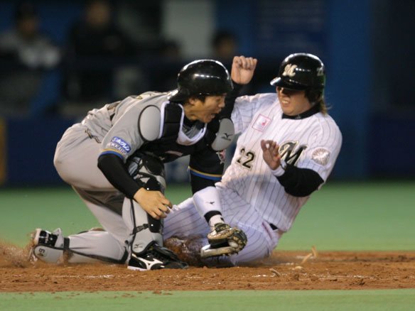 8番 ベニー 中犠飛 1-2から振り抜いたセンターへの打球。森本が前進して勢いをつけて捕球し、バックホームしたが、3塁ランナー・里崎、思い切りよくタッチアップし、ホームへスライディング!足をうまく入れて先制のホームイン!1対0。 ![]() 1