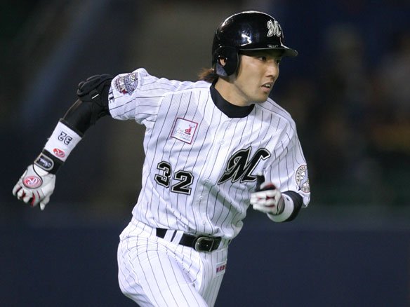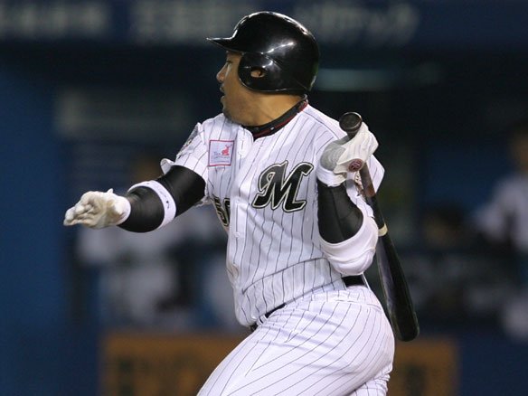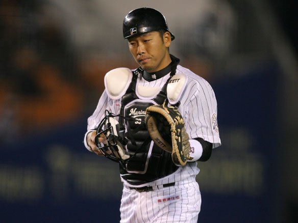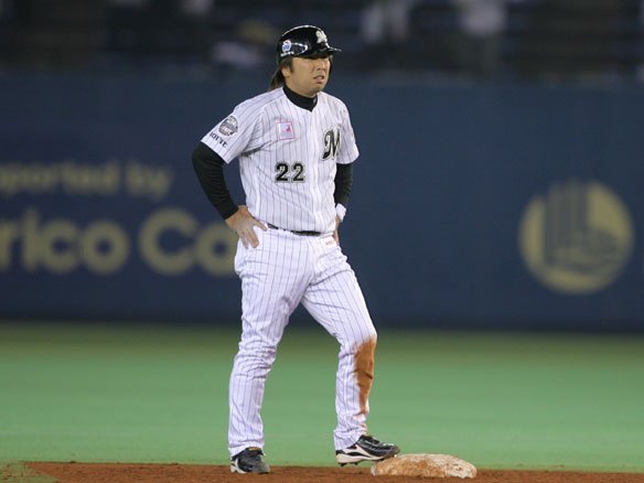 4番 里崎 左安 1-2から引っ張り三遊間を抜いた! |