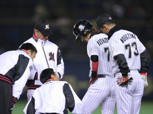 死球を受けた西岡を心配そうに見つめるバレンタイン監督