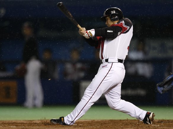 3番 里崎 右安 ファールで粘り、2-2からの7球目をカットしたところで里崎はバットを交換。その直後の8球目、アウトコース真ん中へのシュートに逆らわずに押っつけ、クリーンヒット! |