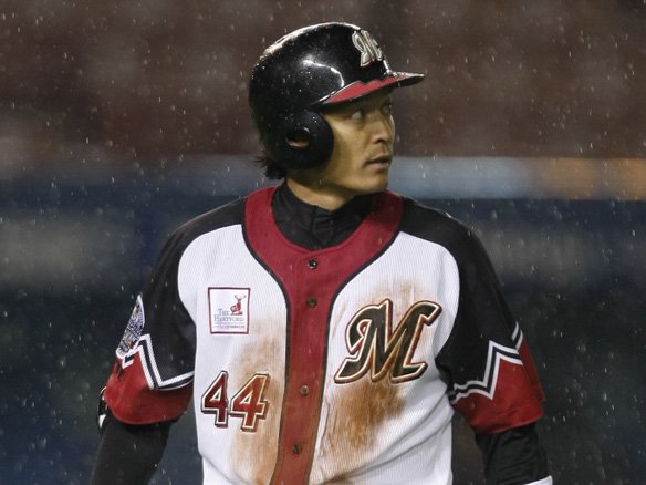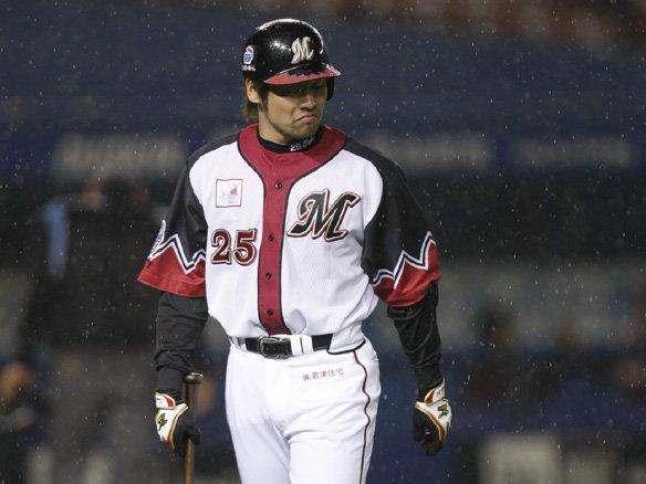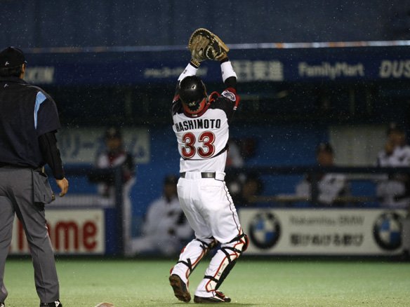 9番 藤井彰 捕邪飛 1-0からスクイズを狙ったが、マリーンズバッテリーがこれを読み、アウトコース高めへ外した。しかしボールはキャッチャー・橋本のグラブを弾き、後逸。この間に3塁ランナー・鉄平、ホームイン。0対3。記録はホームスチール。 |