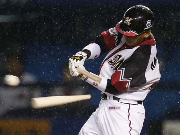 3番 里崎 一ゴ 1-1から止めたバットにボールが当たってしまい、1塁線への弱いゴロに・・・。 |