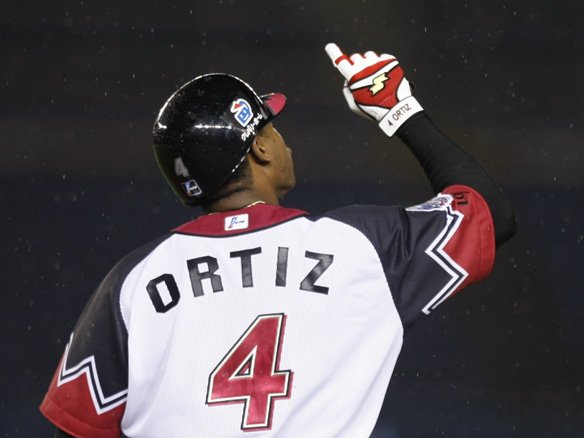 5番 オーティズ 右安 1-0からのストレートを弾き返した鋭い打球は、セカンドの頭上を越え、クリーンヒット! |