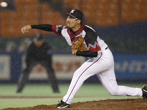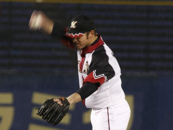 投手 シコースキー (千葉ロッテ 投手・根本→シコースキー) シコースキーが雨にも負けず、白線を飛び越えて全速力でマウンドへ向かい、今日も腕をグルグル! |