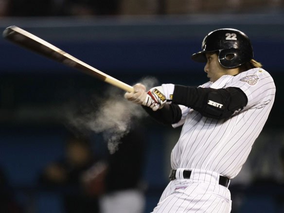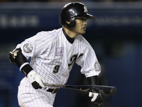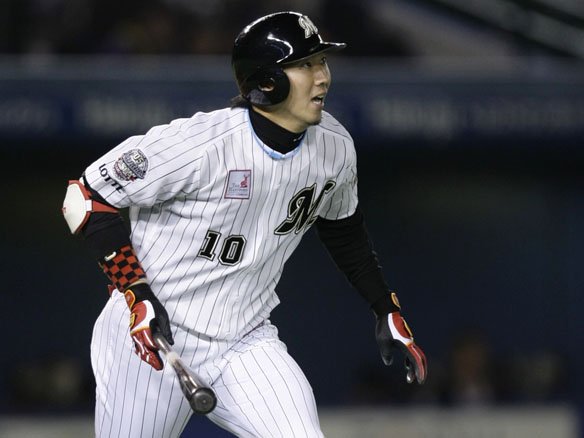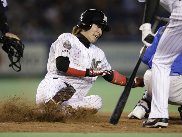 4番 里崎 右安 1-1からインコース高めのストレートを詰まらせながらも振り抜いた打球は、突っ込んできたライト・G.G.佐藤の前に落ちた!2塁ランナー・西岡、悠々と先制のホームイン!1対0。 ![]() 1