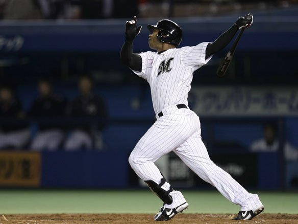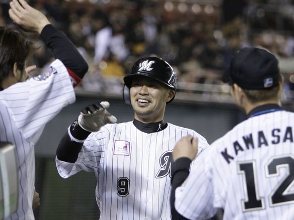 福浦の2本目はタイムリー!休むことなく攻撃を続け、これで全投手から4イニングス連続得点!! |