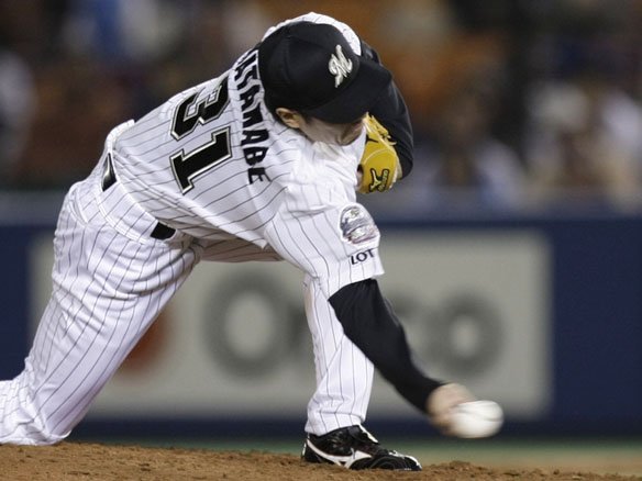 投手 渡辺俊 渡辺俊、2者連続三振を奪った後、中島にヒットを許しましたが、オーティズのファインプレーに助けられ、チャンスを広げさせませんでした! |
