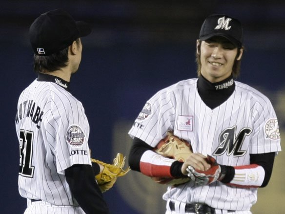 5番 G.G.佐藤 遊併 1-1から詰まらせたボテボテの当たり。ショート・西岡が簡単にさばいて2塁へトスし、6-4-3のダブルプレー! 渡辺俊、内野陣に向かって拍手し、笑顔を見せた! |