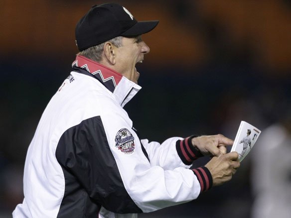 ルールブックを持ち出して審判に抗議するバレンタイン監督