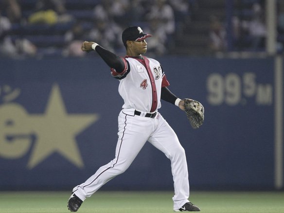 8番 ベニー 遊併 初球を弾き返したが、二遊間を抜けず・・・。ショート・金子誠がさばき、2塁へトス。そのまま1塁へ渡り、6-4-3のダブルプレー・・・。 |