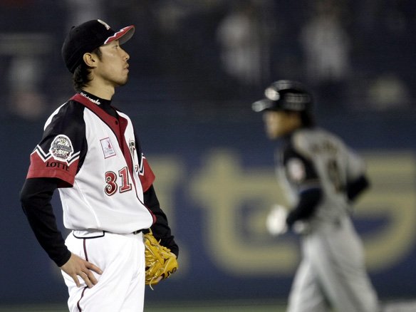 投手 渡辺俊 投手 渡辺 9番 金子誠 見三振 2-1からインコース真ん中へ浮き上がるシンカーに手を出せず! |