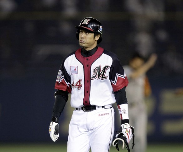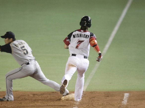 1番 西岡 遊併 2-2から引っかけてしまった2塁ベース付近への打球。ショート・金子誠が回り込み、そのまま2塁を踏んで1塁へ送球。ダブルプレー・・・。 |