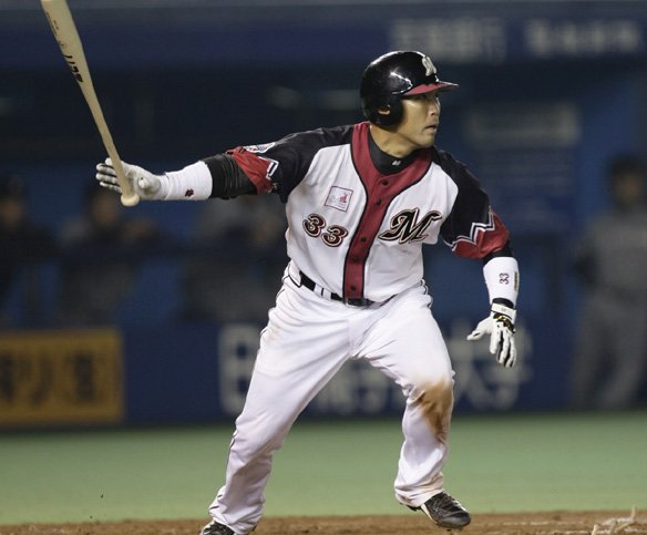 3番 福浦 二ゴ 2-2から引っ張った一二塁間への打球。しかしセカンド・田中賢が飛び込んで押さえ、惜しくも一二塁間を抜けず・・・。 |