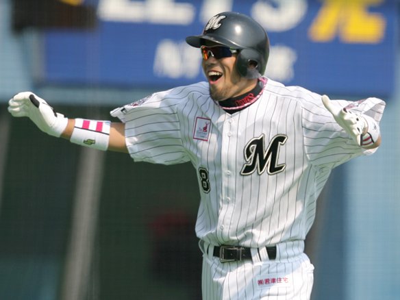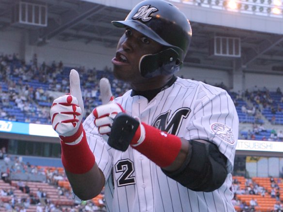 4番 ズレータ 左中本 1-1から真ん中高めへ甘く入ったスライダーを完璧に捉えた当たりは打った瞬間にわかる2号ソロホームラン! 今年から新設されたスタンドデッキ到達第1号の特大アーチ!!12対7。 ダイヤモンドを一周したズレータ、新“幕張ファイアー”をお披露目! ![]() 11